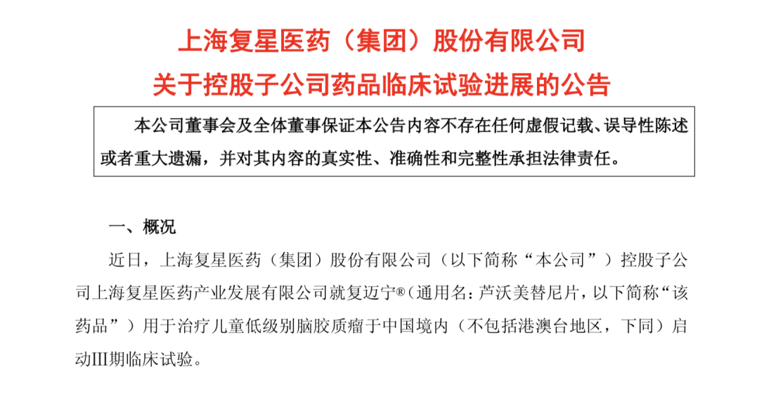 全球研发 | 中国首款!复迈宁®用于治疗儿童低级别脑胶质瘤适应症进入III期临床