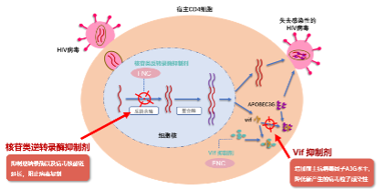阿兹夫定抗HIV的机制主要在于其可作用于双靶点,强效干预HIV生命周期。其双靶点是指同时抑制核苷类逆转录酶和Vif两个靶点,作为核苷类逆转录酶抑制剂(NRTI),可抑制逆转录酶以及病毒核酸链延长,阻止病毒复制,作为Vif抑制剂,可增加宿主抗病毒因子A3G水平,降低新产生的病毒粒子感染性,进而达到强效抑制HIV复制的作用。
