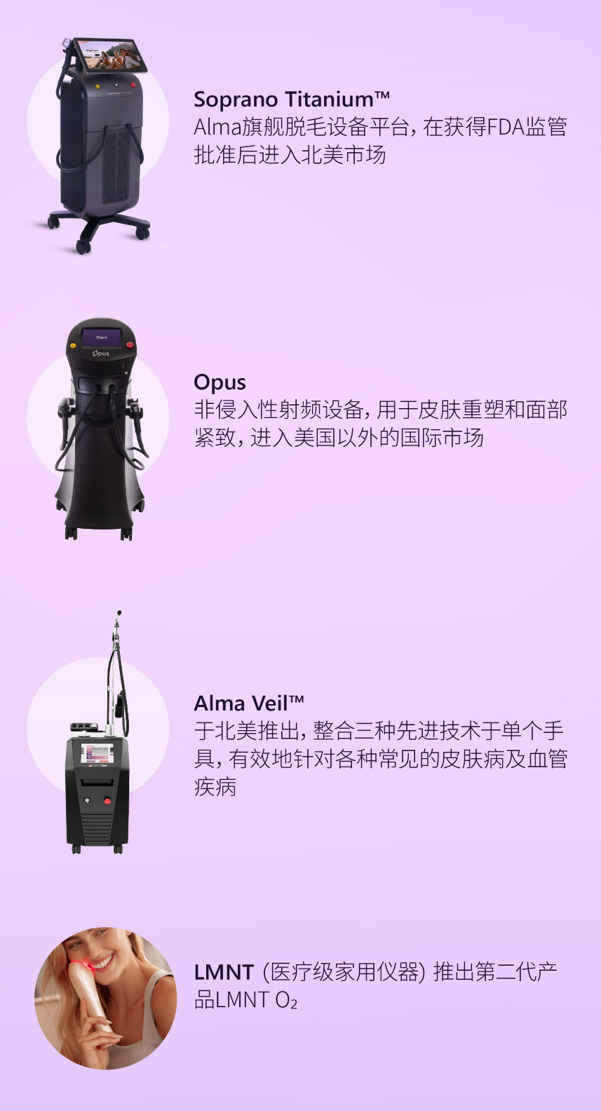 Alma Veil™:于北美推出,整合三种先进技术于单个手具,有效地针对各种常见的皮肤病及血管疾病。