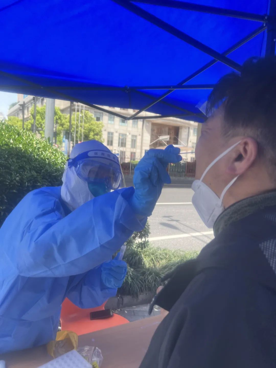 记得四月一场暴雨过后,气温未降,反而更湿热,我当时在蓝色遮阳棚下做着核酸采样工作,突然感觉到一滴一滴的水从后背划过,忙问身旁的志愿者是不是棚顶破了漏雨了,志愿者愣了一下,然后笑我:“是不是忙傻了?就算是遮阳棚破了,你还有防护服呢!”