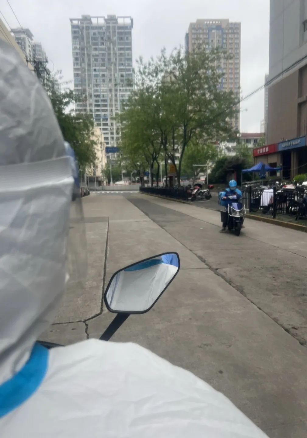 因为一天要辗转几个小区,大巴车来回接送太麻烦,我们小组就一起穿着防护服骑单车往返各个小区进行采样……空旷的道路上一下子多了一队“骑单车的大白”,真是一道可爱的风景线!