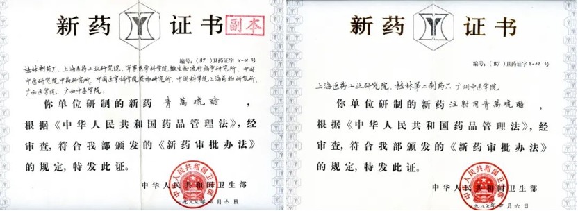 左图:1987年青蒿琥酯获颁中国卫生部X-01号新药证书