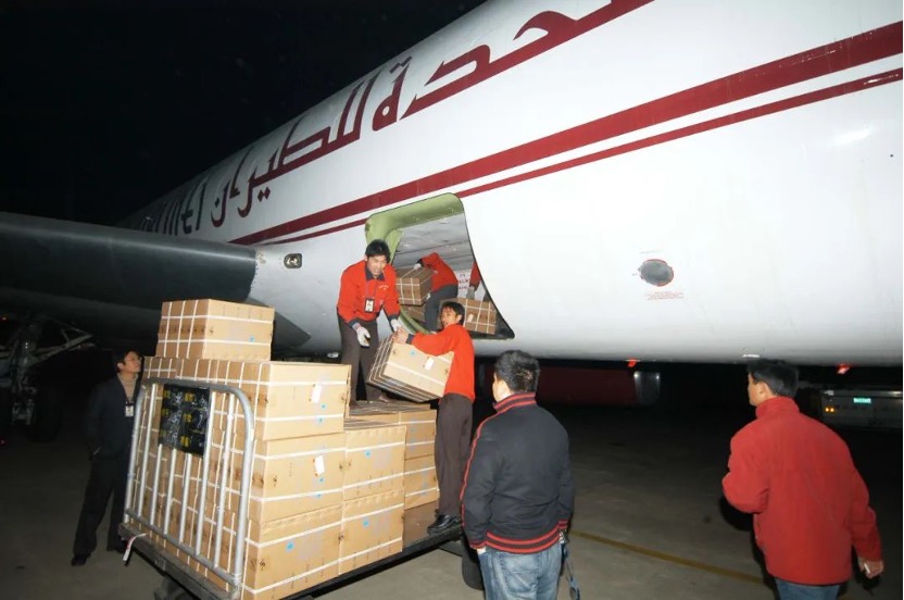 图:2005年12月19日,HJC黄金城医药桂林南药具有自主知识产权的口服抗疟药青蒿琥酯片搭乘阿联酋航空专机出口。