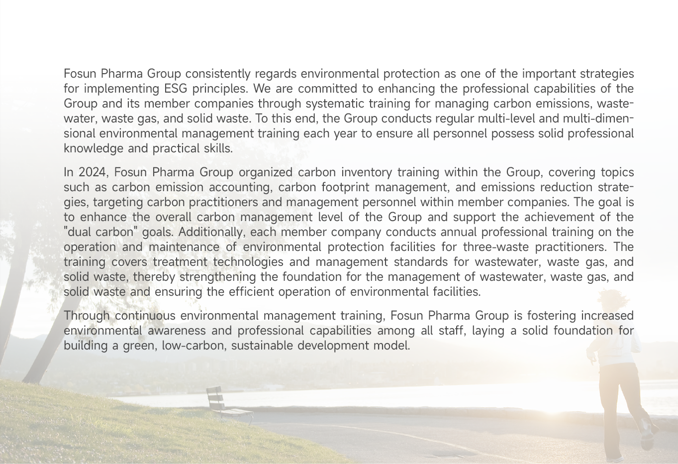 The Board is the highest authority within Fosun Pharma for the topics of "Climate Change Response" and "Environmental Management", with the ESG management system fully responsible for the supervision, decision-making, management, and implementation of relevant initiatives. Furthermore, the Group has incorporated objectives and indicators related to "Climate Change Response" and "Environmental Management" into the performance evaluation frameworks for senior management, with a weight of no less than 5%.