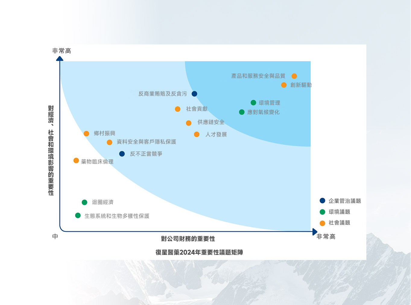 復星醫藥集團構建了由董事會及董事會ESG委員會、ESG管理委員會、ESG工作小組組成的ESG治理架構,以確保董事會及管理層對可持續發展的有效監管、科學指導及全力支援。