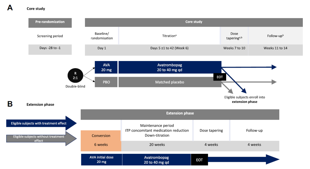 AVA, 阿伐曲泊帕; EOT, 治疗结束; ITP, 免疫性血小板减少症; PBO, 安慰剂; qd, 每天一次