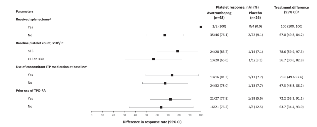 共74例受试者在核心治疗期随机接受马来酸阿伐曲泊帕(n=48)或安慰剂(n=26)治疗。基于全分析集的分析结果显示,治疗6周后,马来酸阿伐曲泊帕组的受试者血小板反应率为77.1% (95% CI:62.7%, 88.0%),安慰剂组为7.7% (95% CI:1.0%, 25.1%),两组反应率差值为69.4% (95% CI:56.2%, 86.3%)。研究达到主要研究终点,结果支持马来酸阿伐曲泊帕优于安慰剂。在所有预先定义的亚组(脾切除术状态、基线血小板计数、基线ITP伴随用药)和事后亚组(既往TPO-RA用药)分析结果与主要研究结果一致(图2)。整个研究期间接受马来酸阿伐曲泊帕治疗受试者的平均累积血小板反应时间为15.3周。